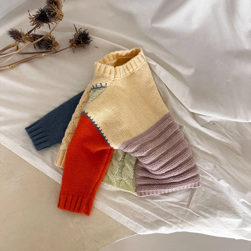 A multi colored knit sweatshirt featuring mixed textures and pastel colors.