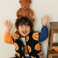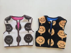 A reversible Sherpa vest featuring a solid color on one side and a fun smiley print on the other side.