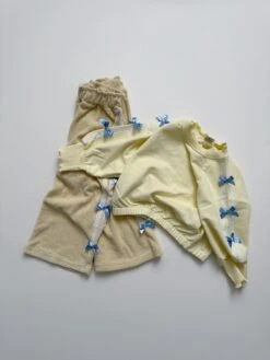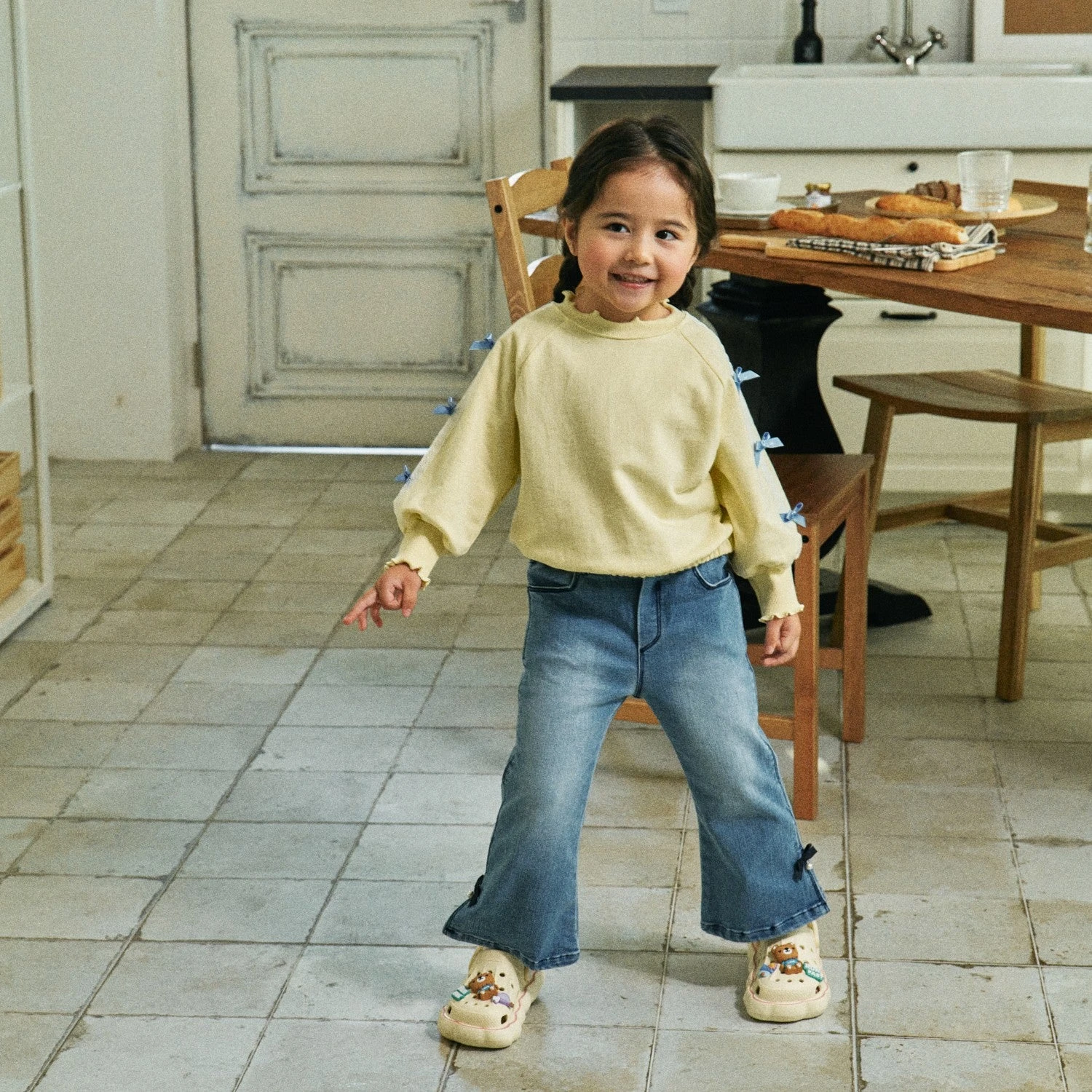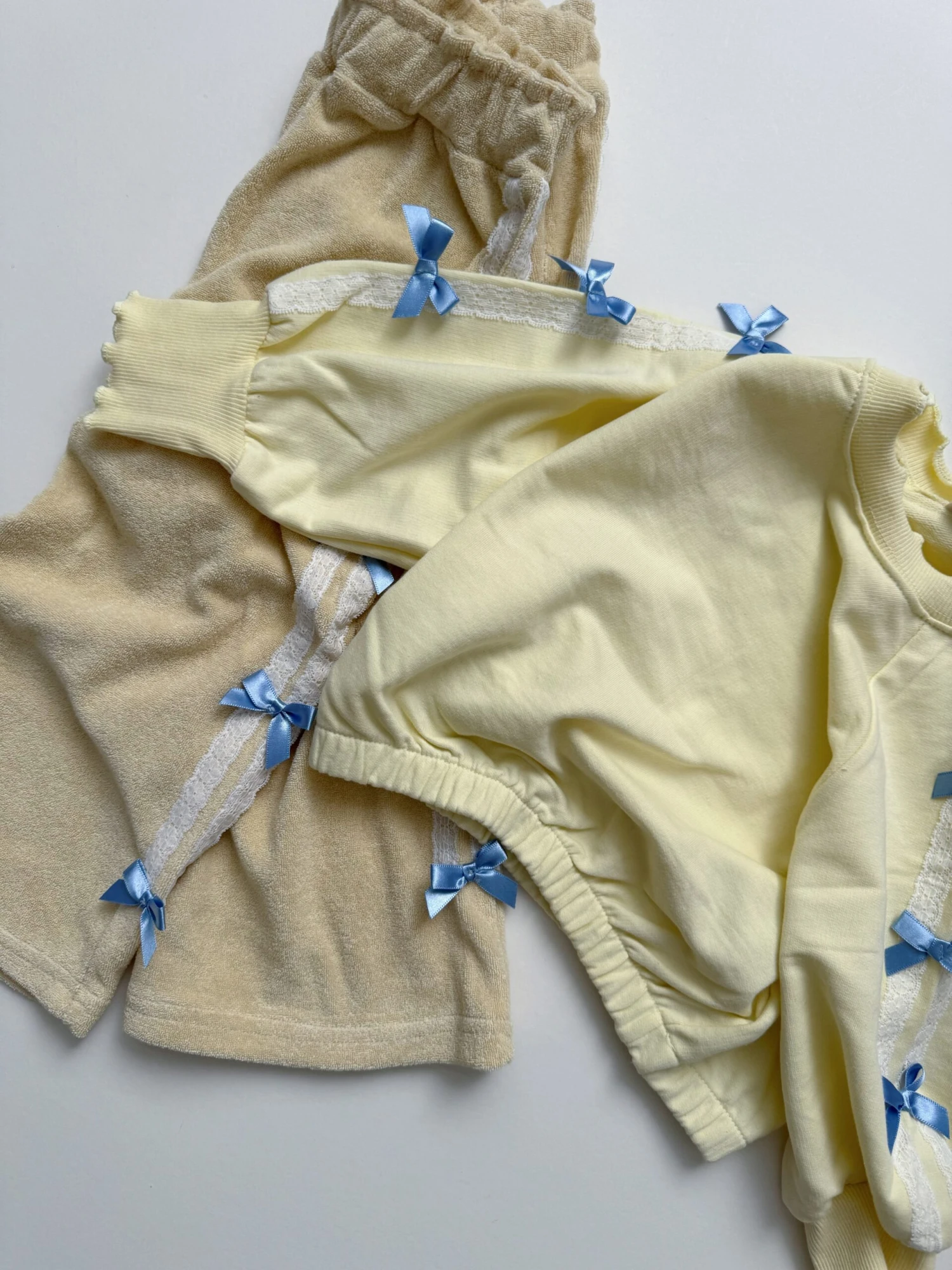 A bubble sweatshirt featuring lace trim and a ribbon bow detail on the arms. Matching pants sold separately.