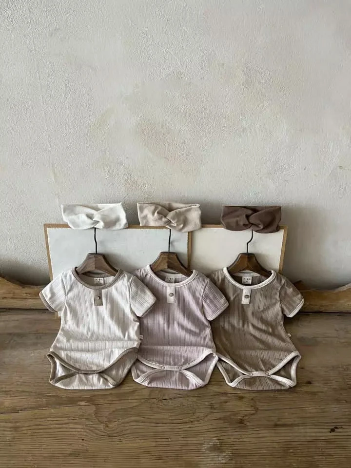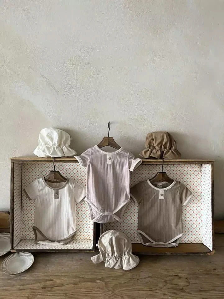 A short sleeved rib romper featuring snap closures for easy diaper changes.