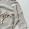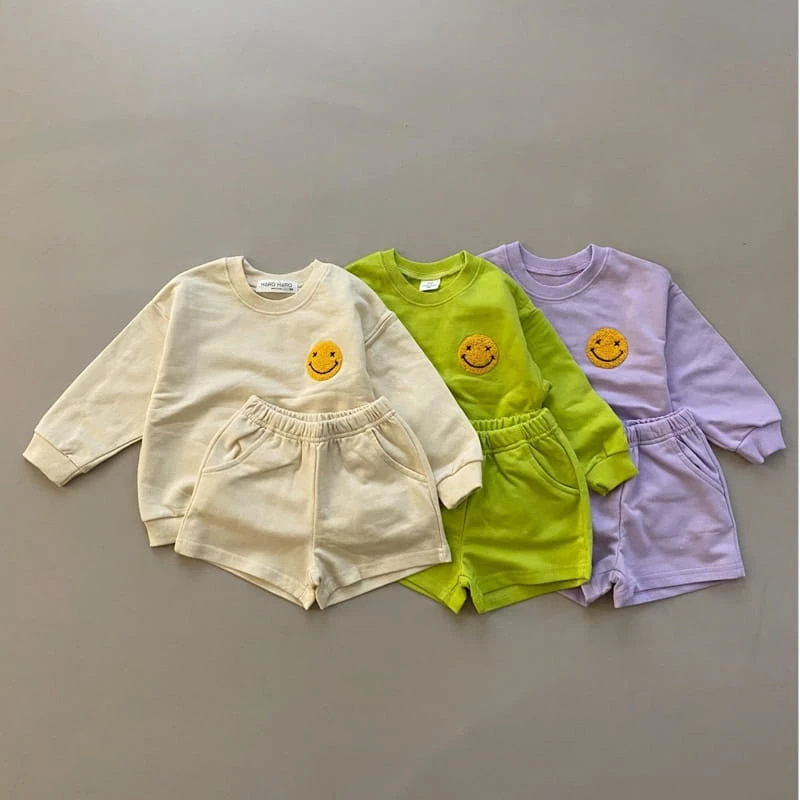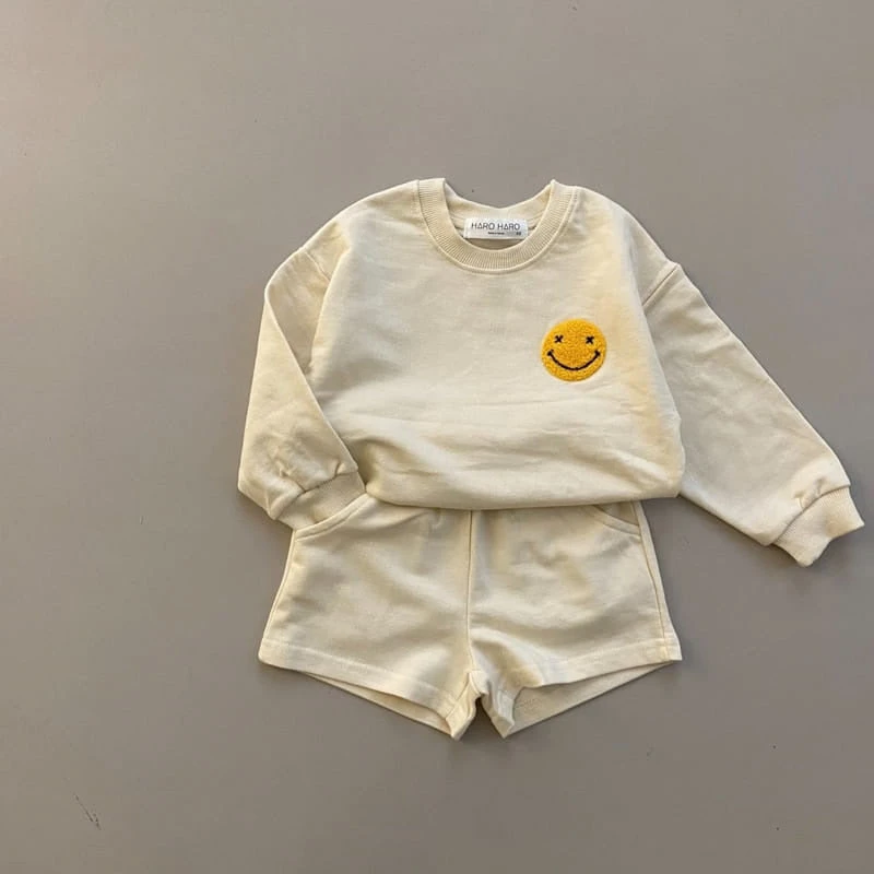 A relaxed fit sweatshirt featuring a fuzzy smiley face patch. Matching shorties with pockets included.