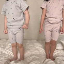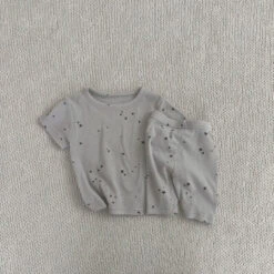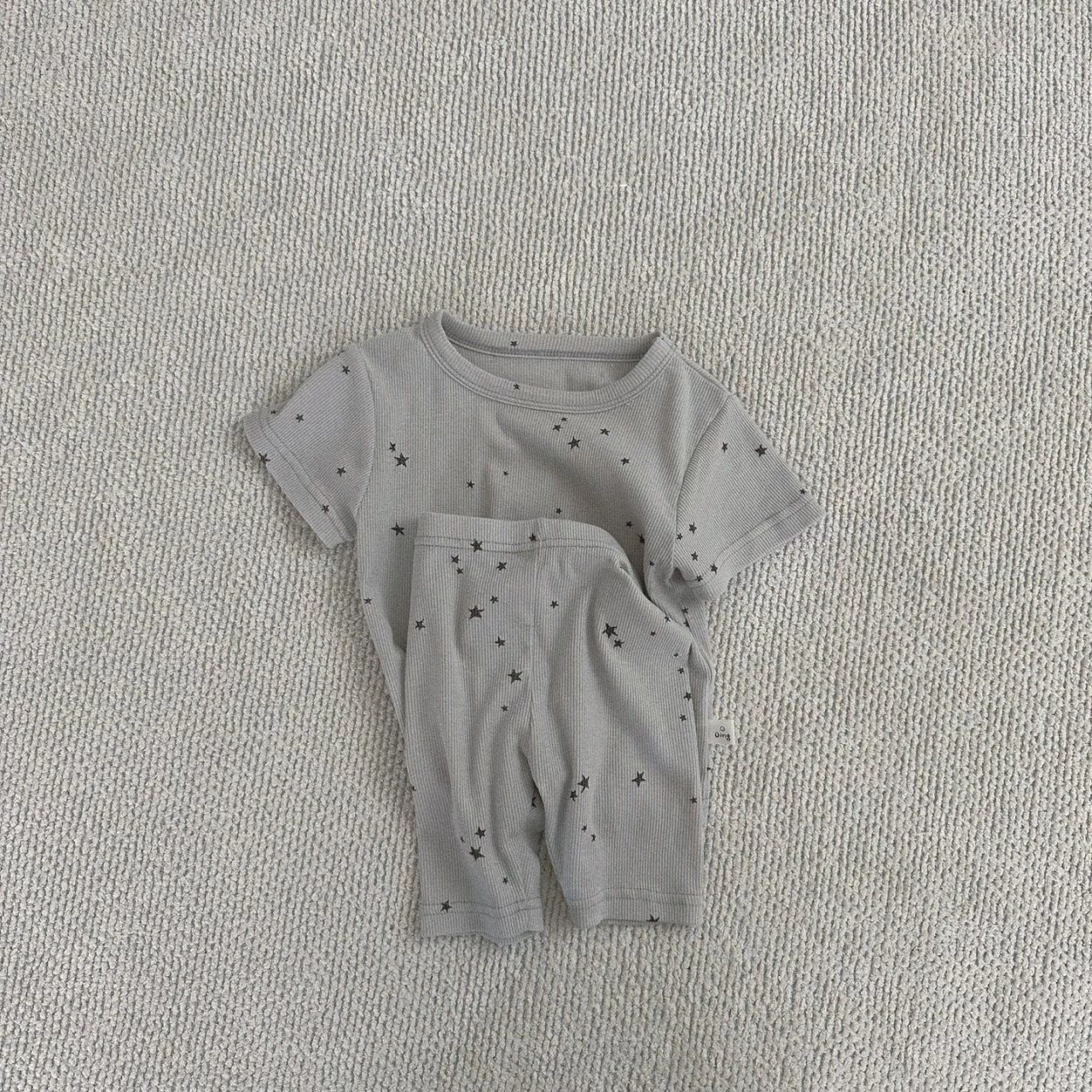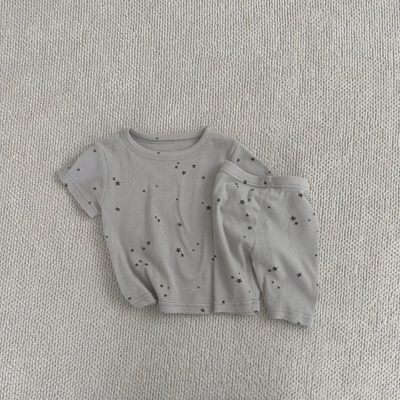Buttery soft, neutral ribbed short-sleeved top and matching shorts set.