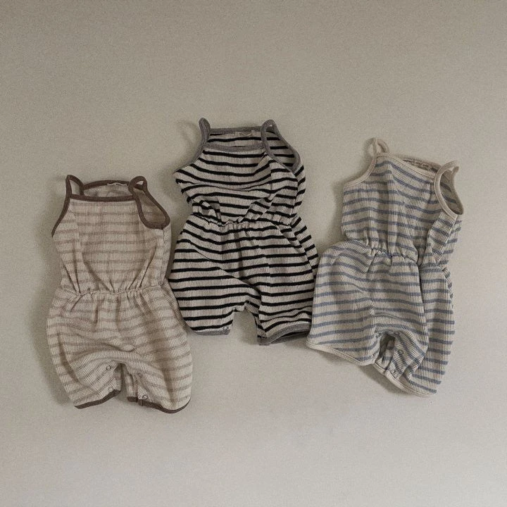 Sleeveless cami waffle striped romper featuring an elastic waistband and snap closures.