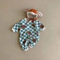 A cozy, fleece long sleeved romper featuring a cute teddy bear checkered print.