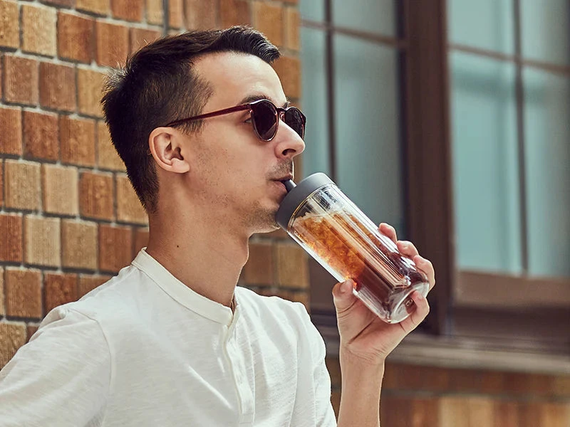 Enjoy the time to unwind and relax with TO GO BOTTLE. The bottle’s double wall structure makes drinks look like they are floating in air and prevents ice from melting quickly, keeping drinks cold for a long time. The straw-type spout is made of soft silicone material which feels smooth on the mouth. With a handle that is comfortable to hold, it is easy to carry around.
