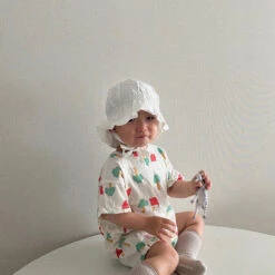 A flowy short sleeved romper featuring the cutest trees and houses graphic. Snap closures for easy diaper changes on the go.