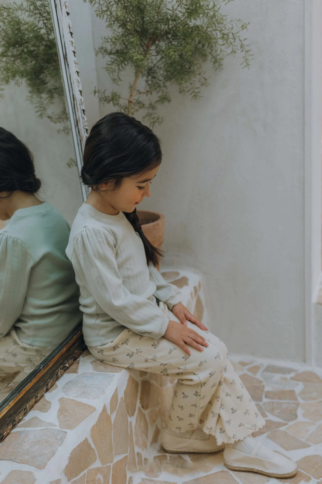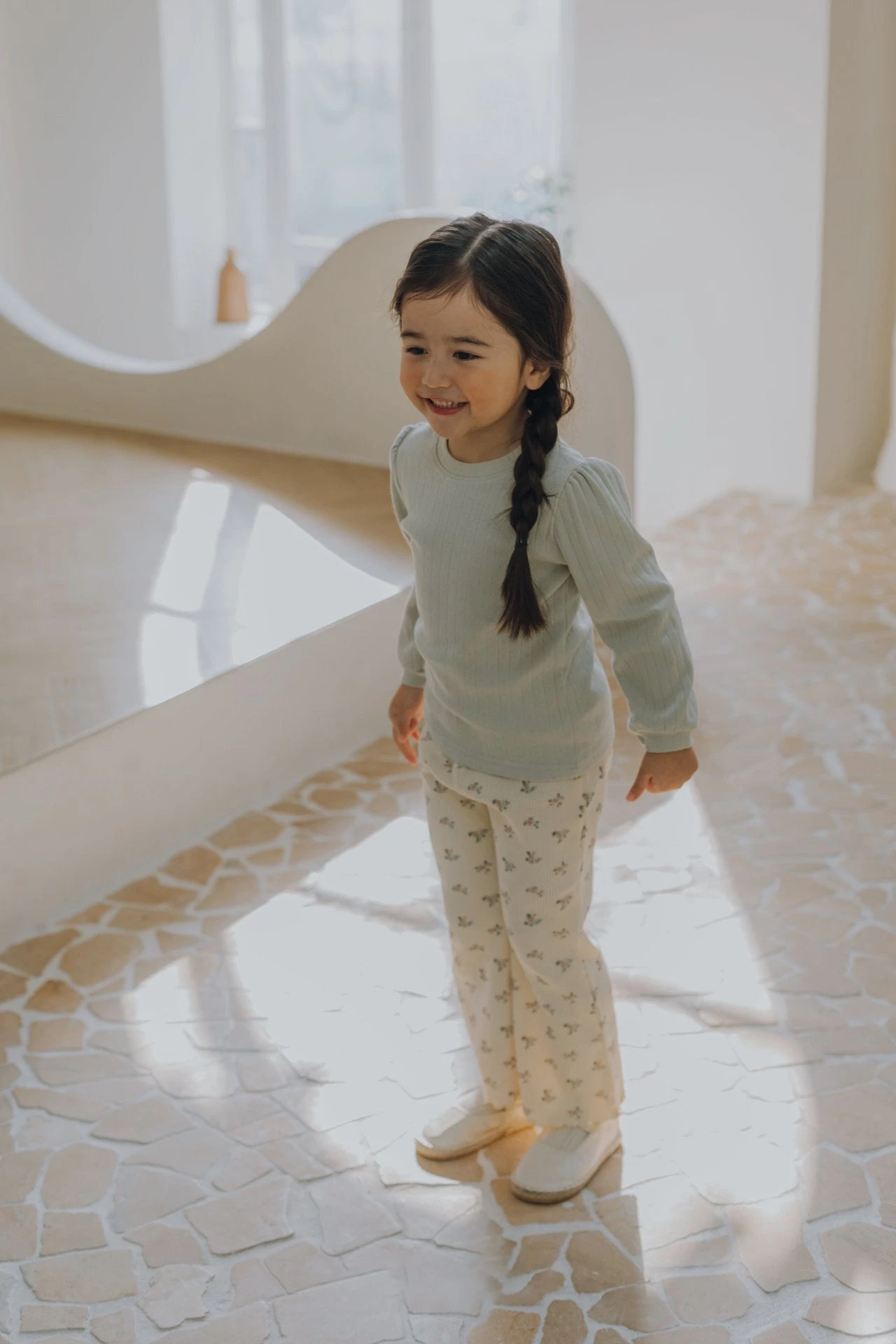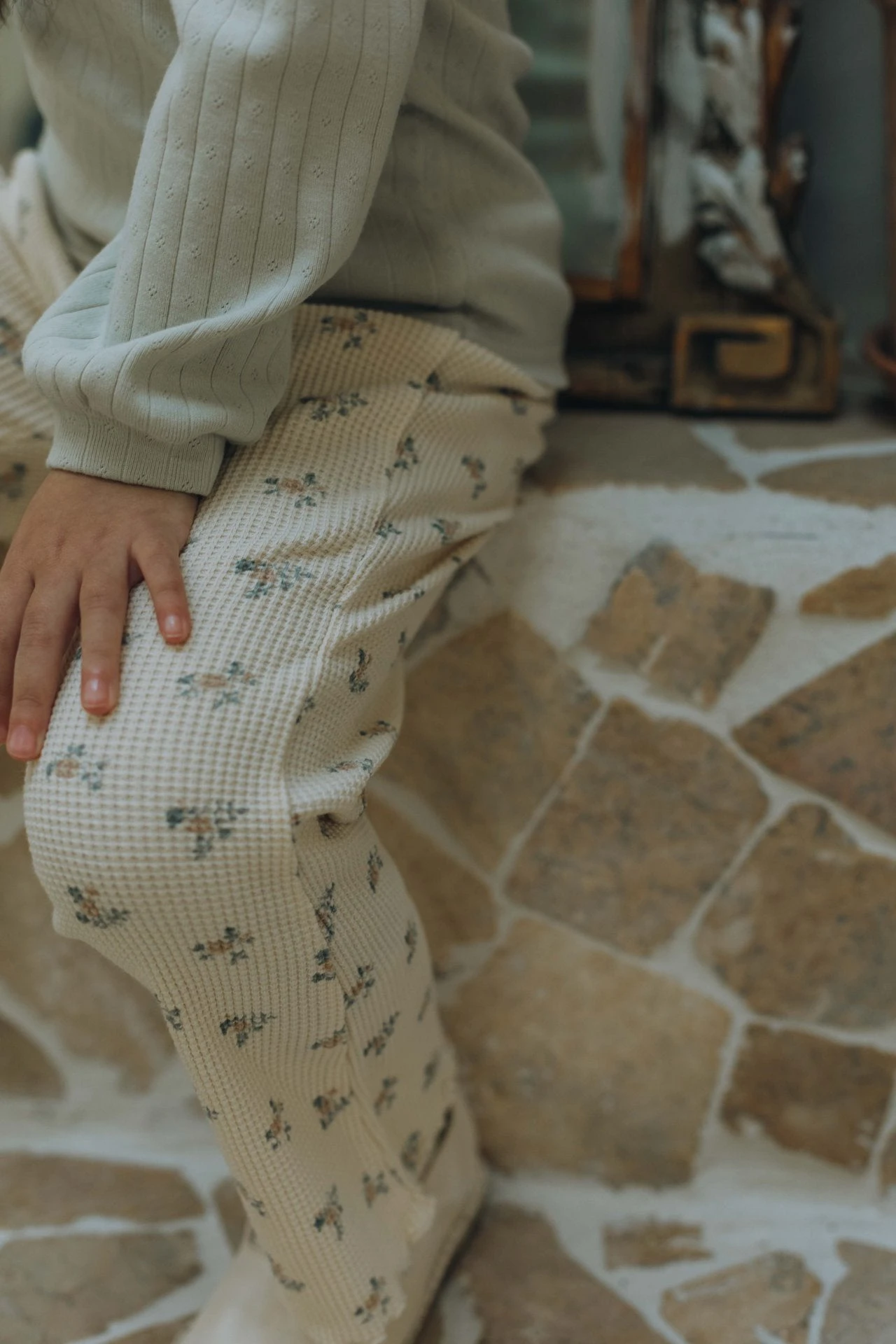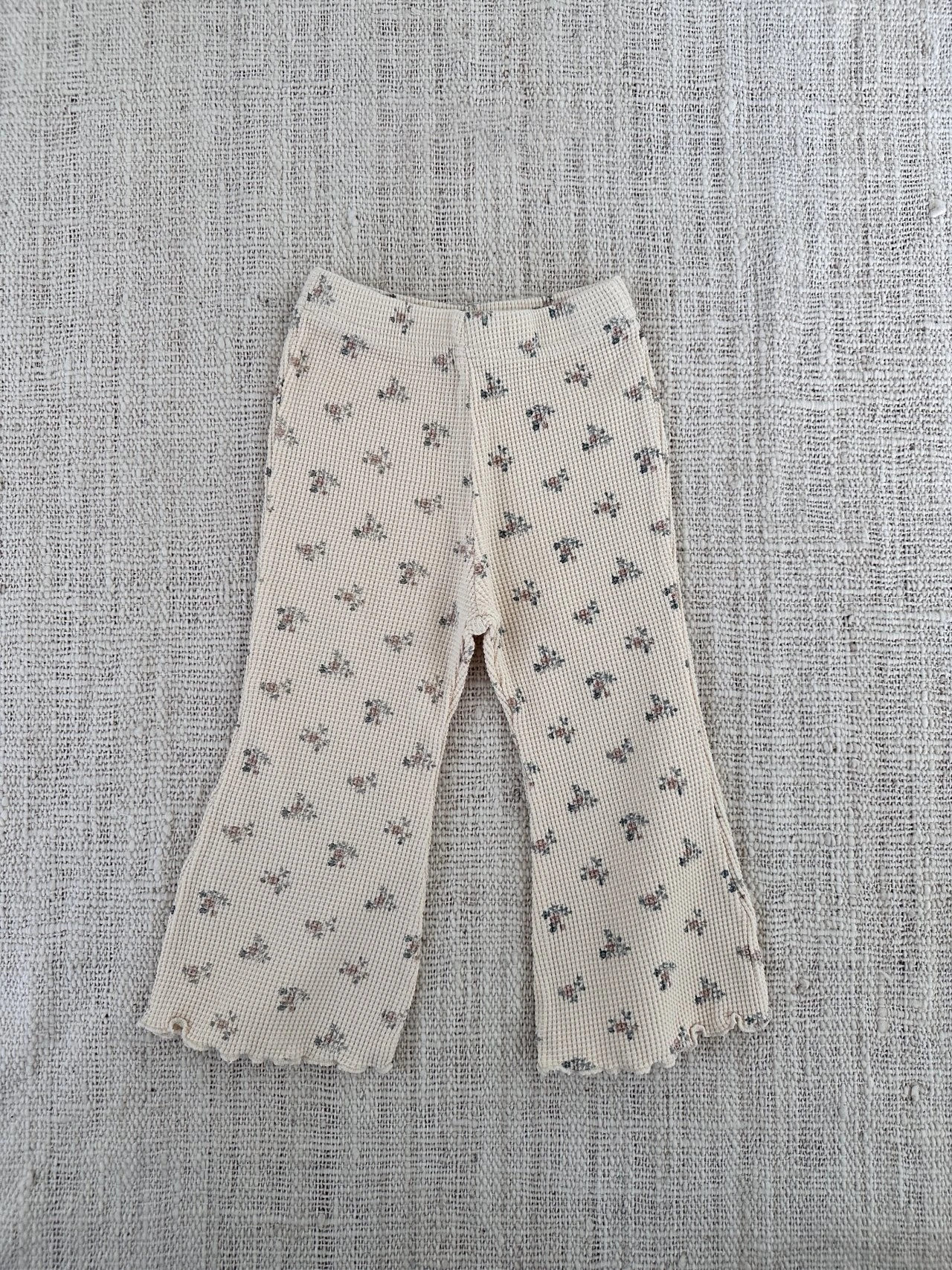 Waffle wide life pants with a slight flare featuring an all over floral print and lettuce trim details.