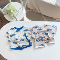 A short sleeved top featuring a fun, allover whale print and matching shorts for a complete look.