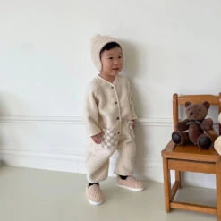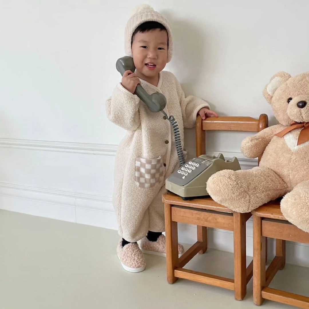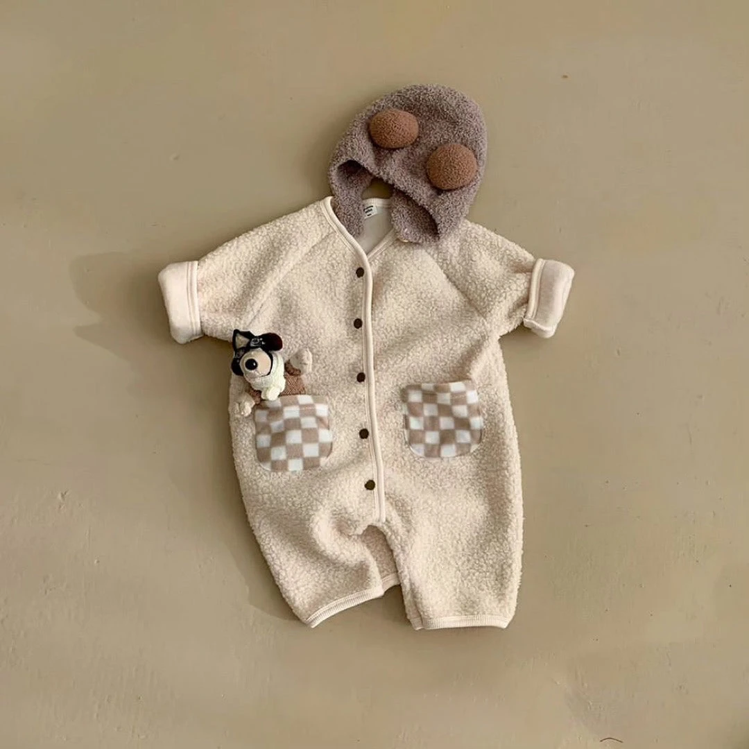 A cozy, long sleeved romper featuring a fleece checkered pockets and button up feature for ease and comfort.