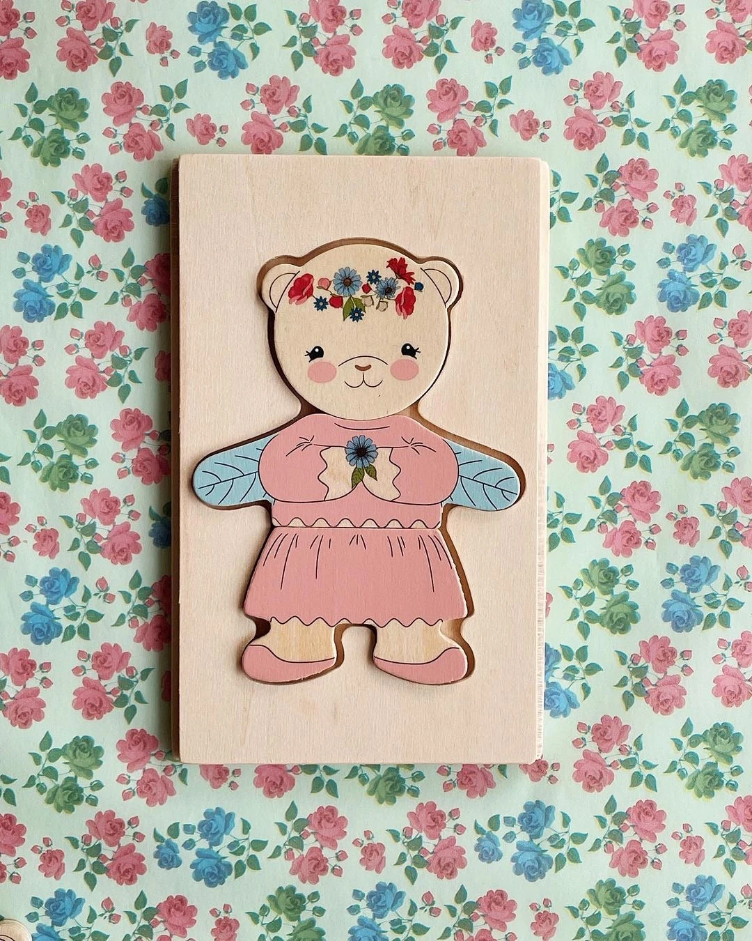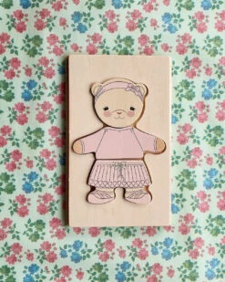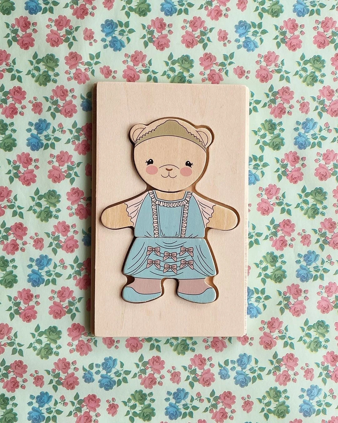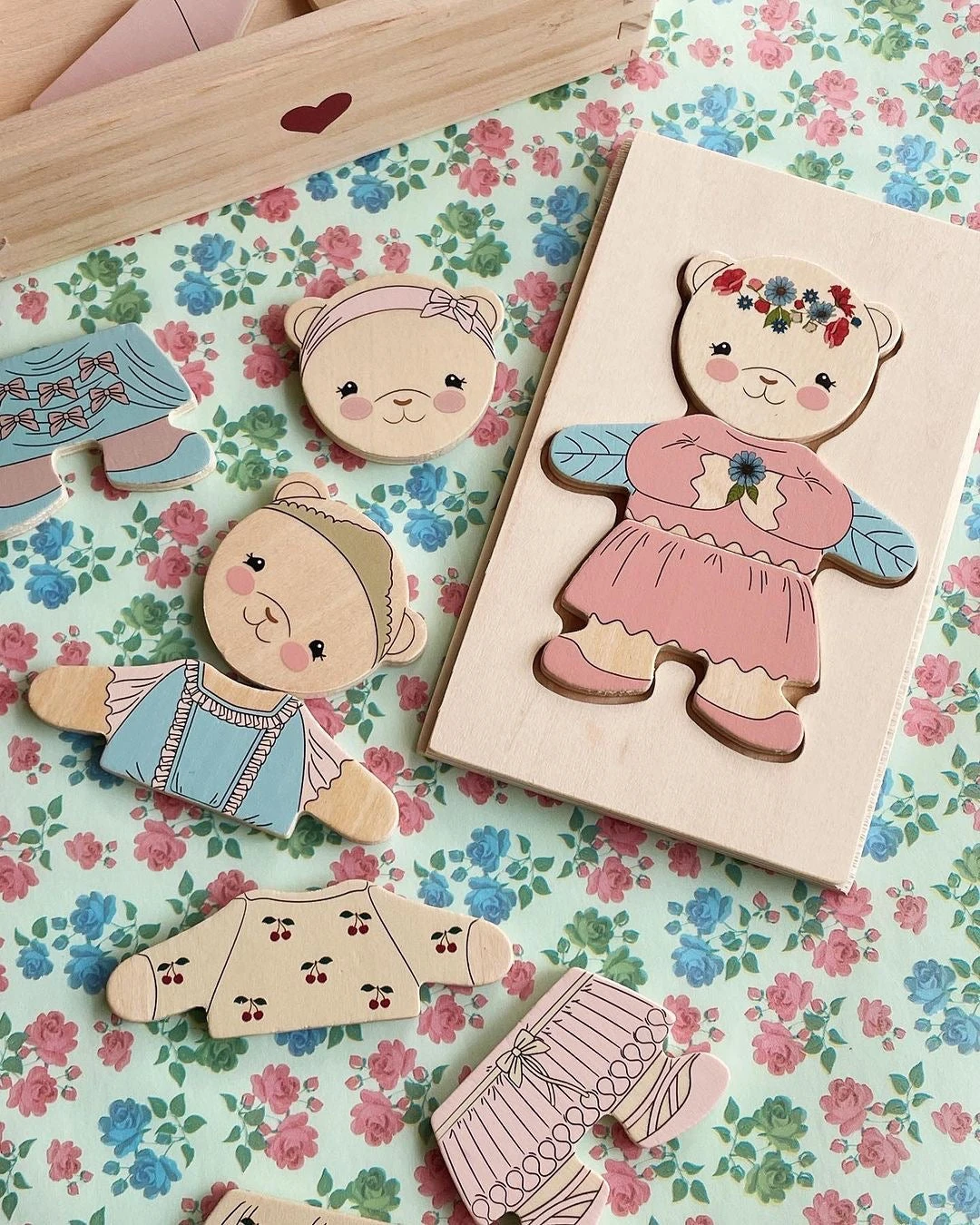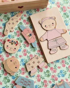 Wooden puzzle that includes four outfits, 12 puzzle pieces, and a wooden box with lid